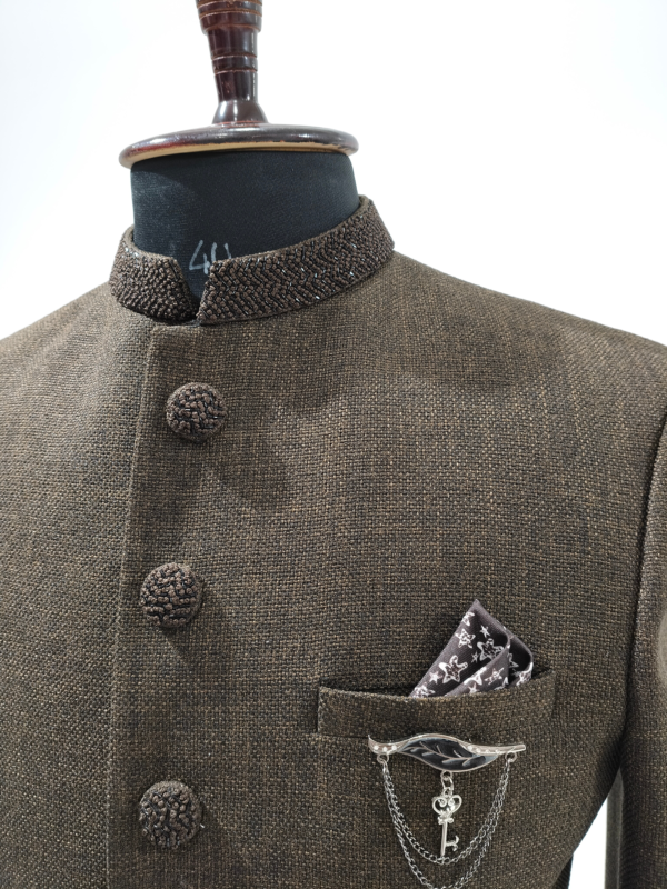 The metallic chain and pocket square add a modern, fashionable edge to the classic bandhgala style.