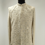 Fabric: The jacket appears to be crafted from a high-quality, textured fabric with a subtle sheen, giving it a sophisticated and elegant look. The material is likely a blend of wool or terry rayon, commonly used for such formal ethnic wear, ensuring both comfort and structure.