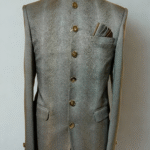 The jacket has a classic bandhgala (Nehru collar) neckline, which stands upright and adds a regal touch.