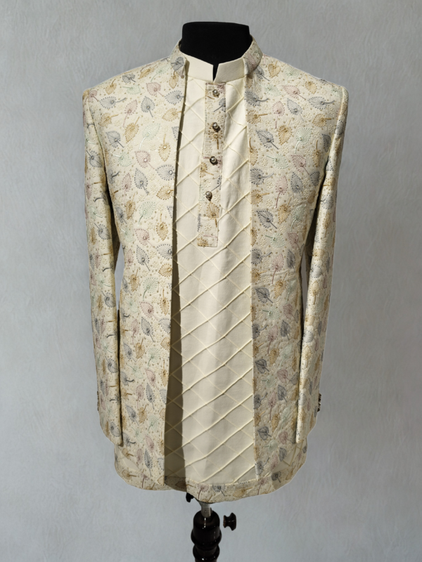 This bandhgala / jodhpuri suit is a versatile piece that blends classic Indian craftsmanship with modern design elements. Its neutral color palette and intricate detailing make it suitable for grooms, wedding guests, or anyone seeking a statement piece for special occasions. The combination of floral embroidery and quilted paneling ensures it stands out while remaining timeless and elegant