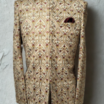The fit is tailored, designed to be worn close to the body for a sharp, sophisticated look, typical of high-end sherwanis and bandhgala jackets.