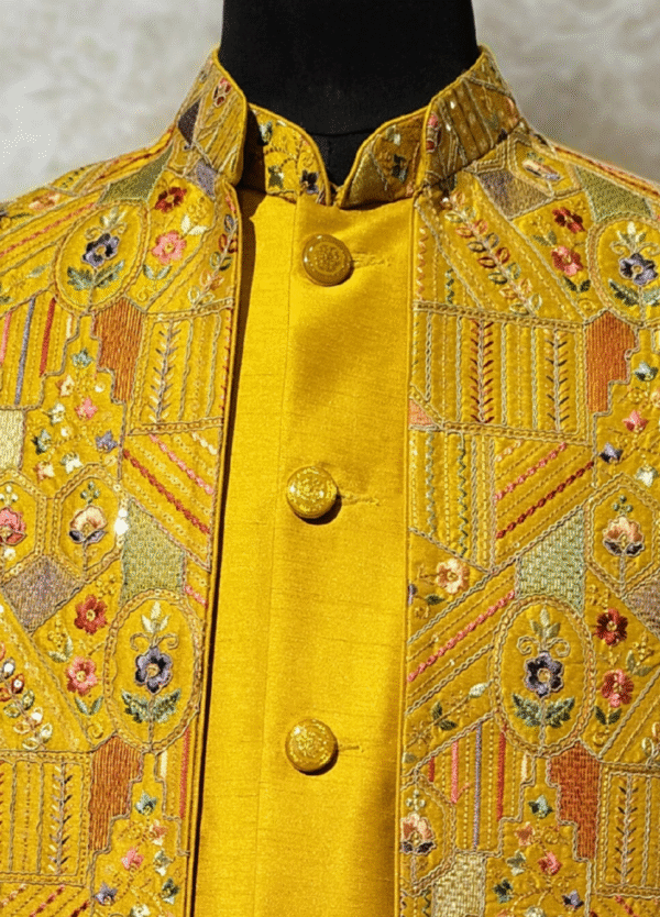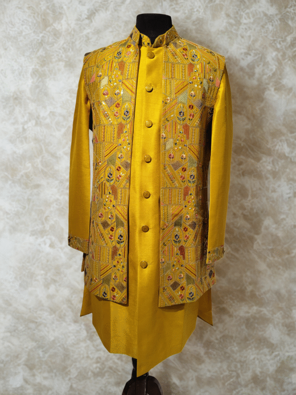 The sherwani is fastened with a row of covered buttons in matching golden fabric, maintaining a seamless and elegant look.