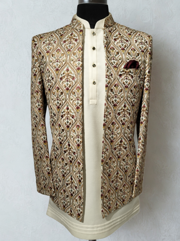 The front placket, collar, and pocket square area are highlighted with detailed embellishments, enhancing the garment’s festive and formal appeal.