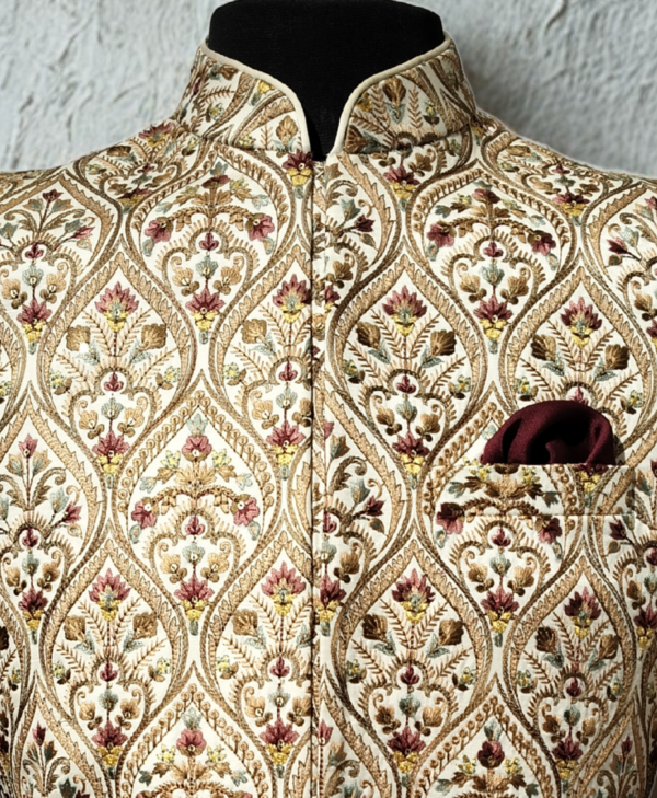 | Embroidery | All-over floral and paisley motifs with gold, maroon, and green accents |